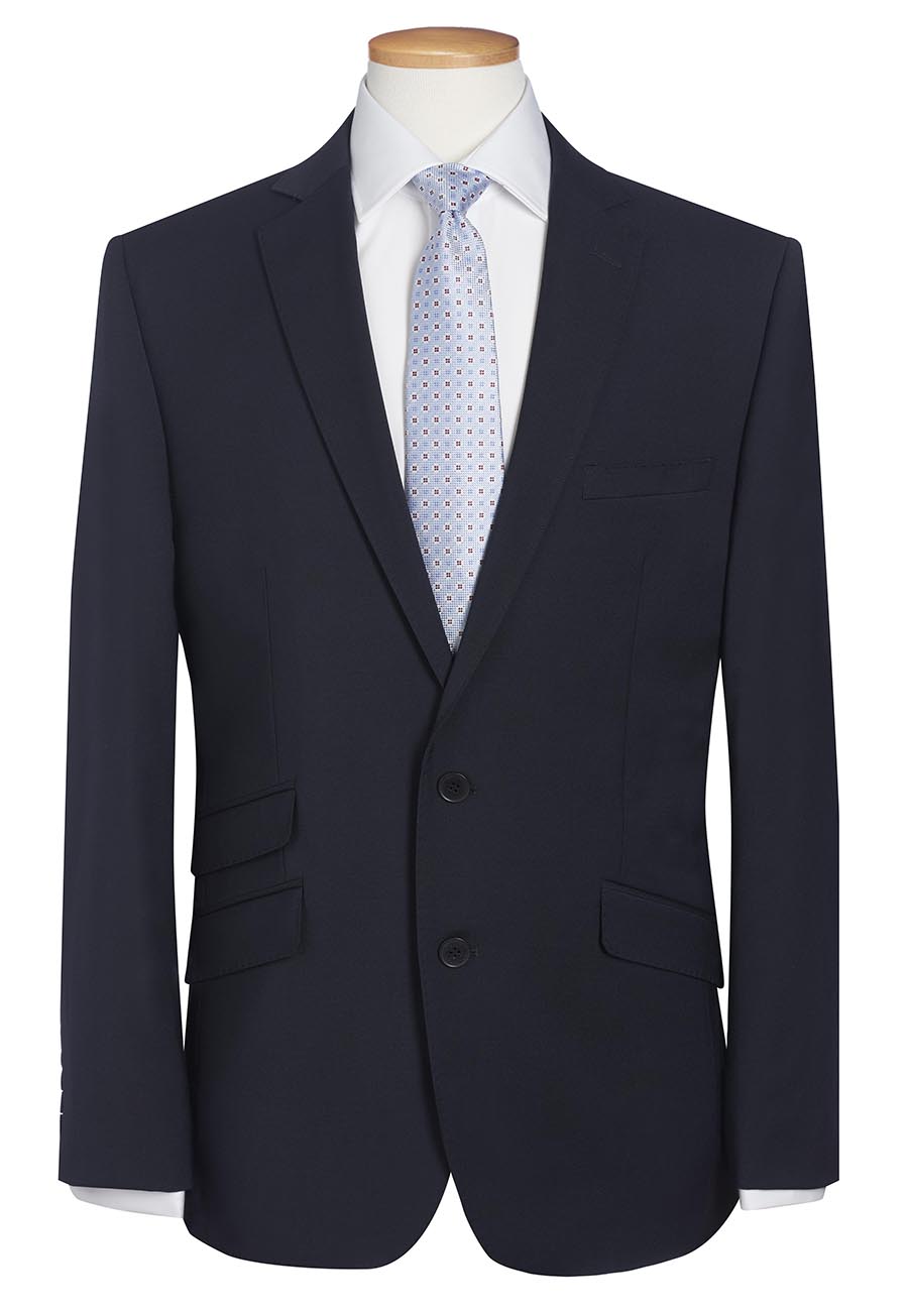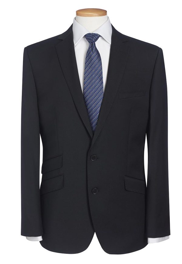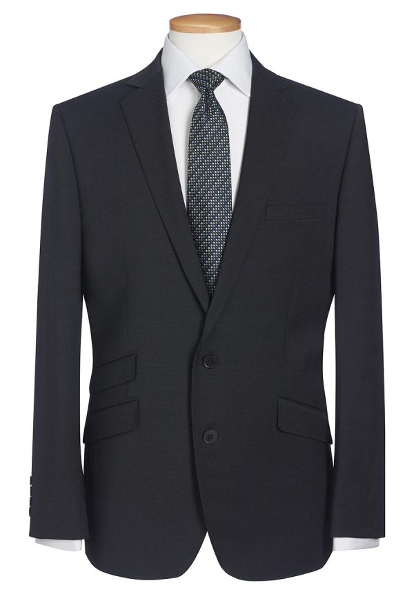 Single breasted slim fit jacket, shorter length, 2 button front, side vents, ticket pocket, slim lapels with saddle stitching, piano faced interior with slim pocket jets.