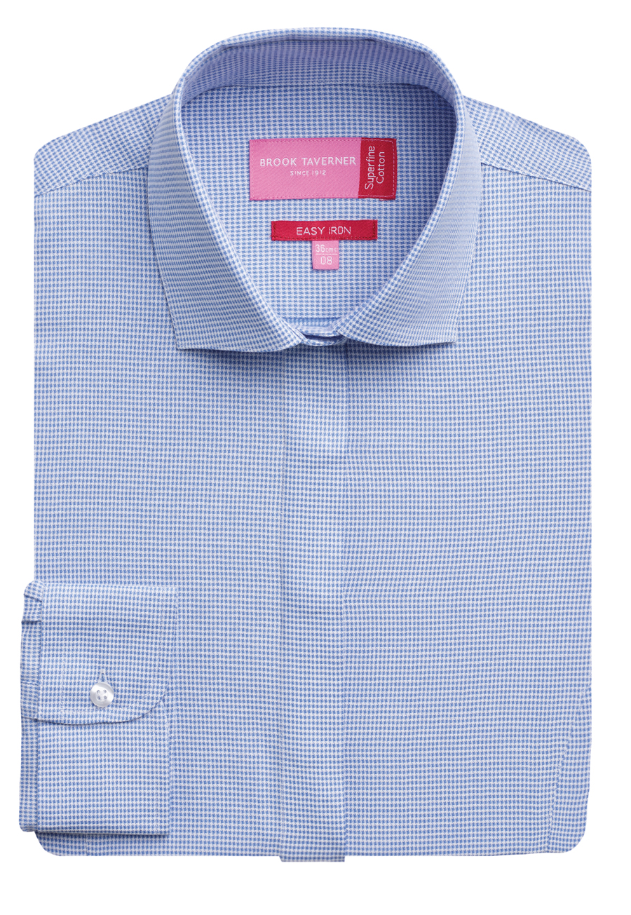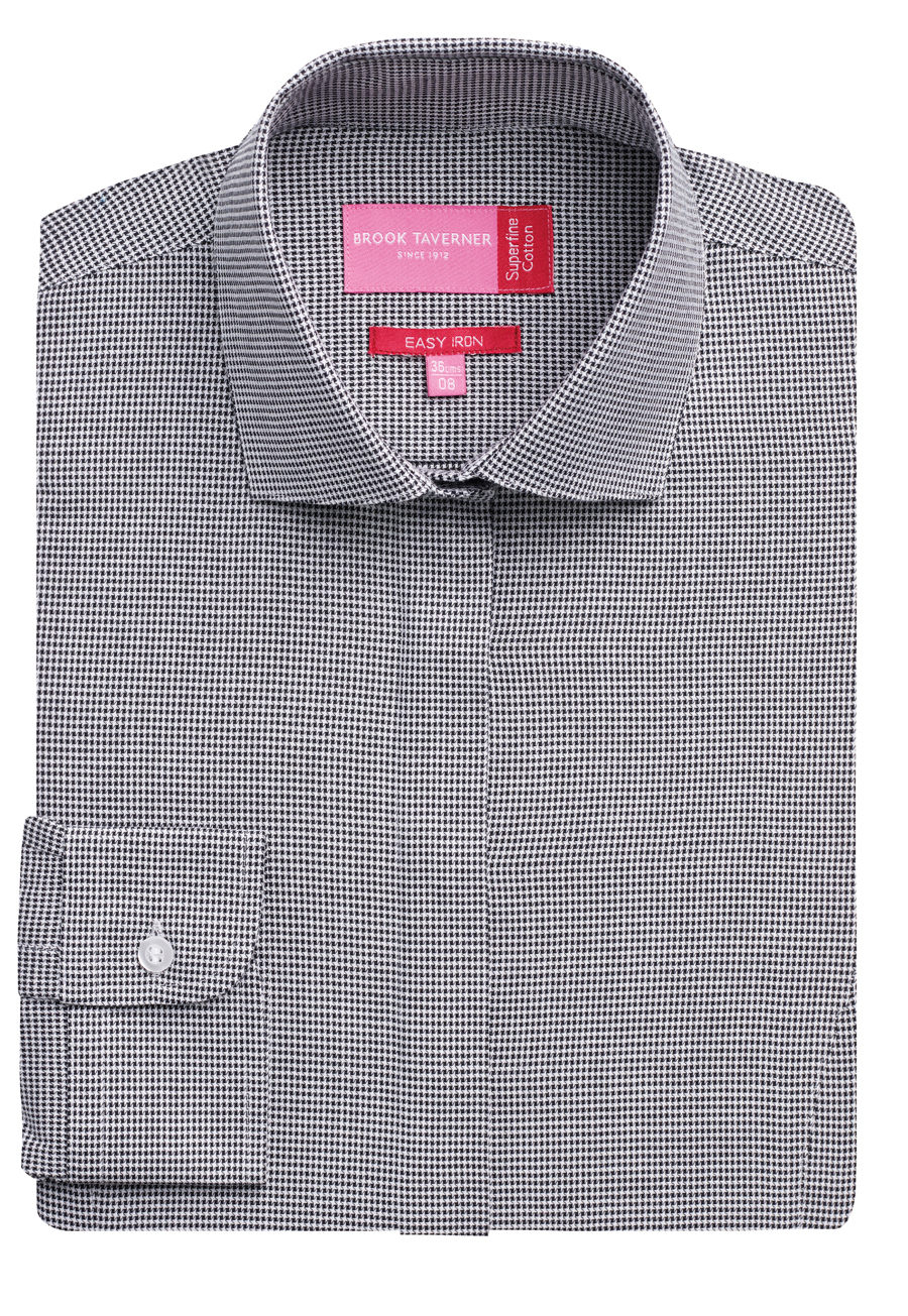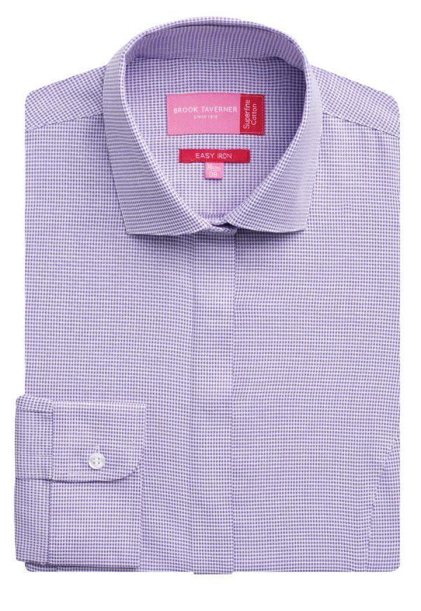 Cotton rich, semi-fitted, long sleeve ladies blouse, Fly front, Button up collar, cutaway collar
