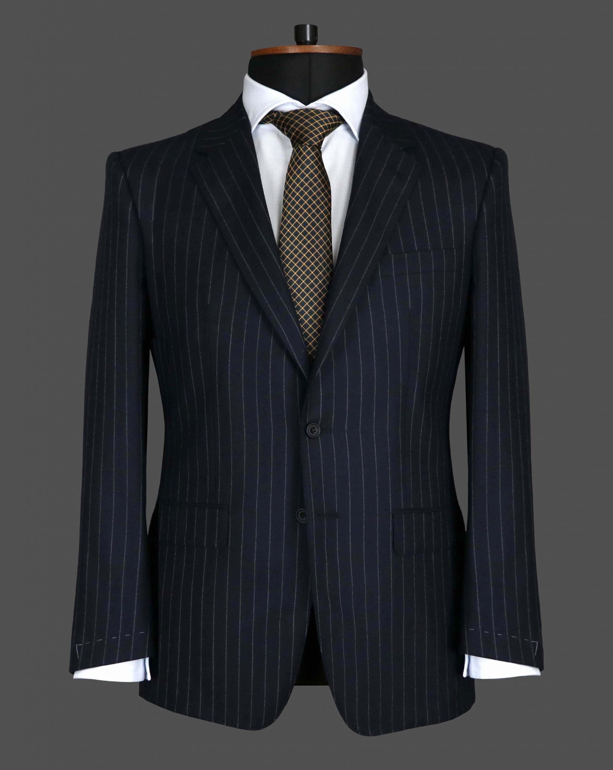 Two button, notch lapel jacket accompanied by flat front trousers with belt loops.