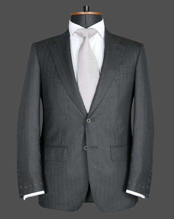 Two button, notch lapel jacket accompanied by flat front trousers with belt loops.