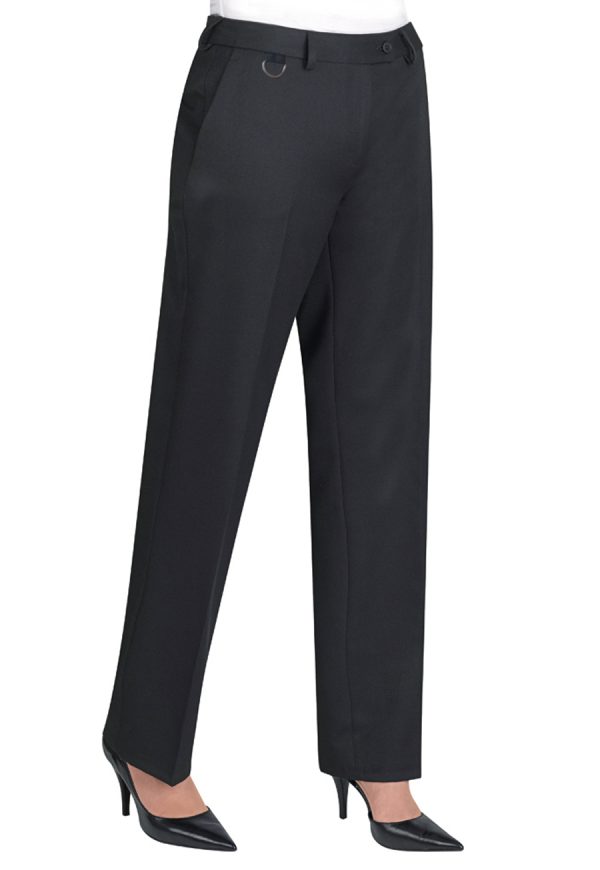Straight leg, slim waistband, with belt loops & key loop, 2 side pockets, mock rear pockets.